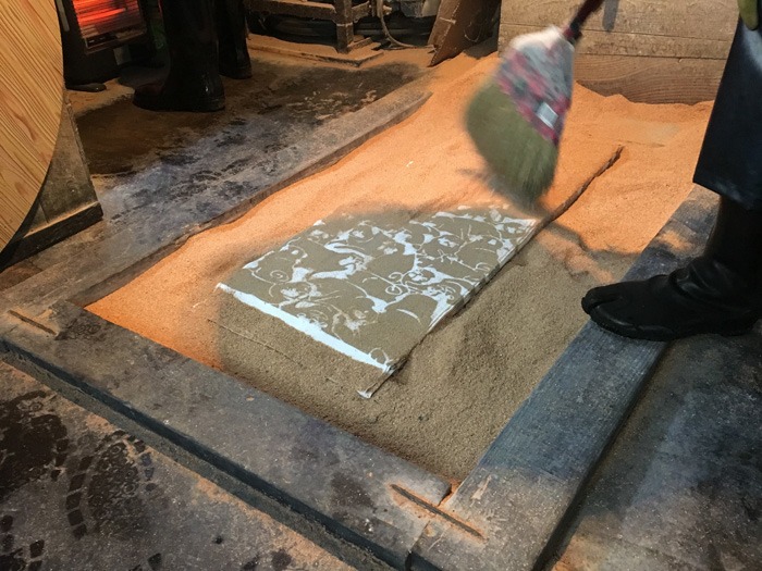 この手ぬぐいは、当店から車で1時間くらいの新潟県阿賀野市にあります「越後亀紺屋藤岡染工場」という1748年創業の超超超老舗の染め工場、そこで職人が型を彫り、注染という技法で作られています。最近はインクジェットプリンターなどでも簡単に手ぬぐいは作れます、それはそれでいいです、しかしやはり違うのです、質感、風合い、色の発色、僕はこのようにわざわざ手間をかけて昔ながらのやり方で続いているところで「本物」を作りたいのです。