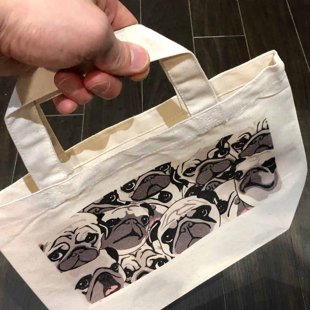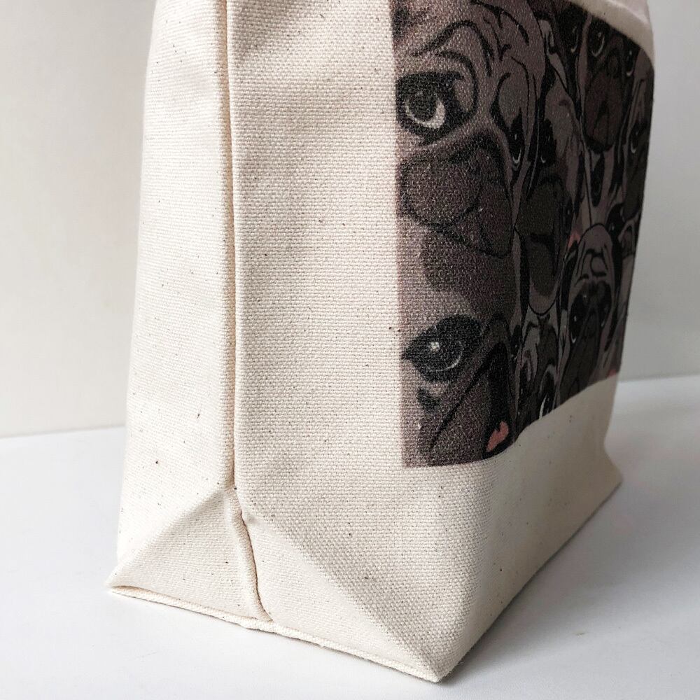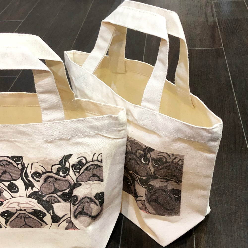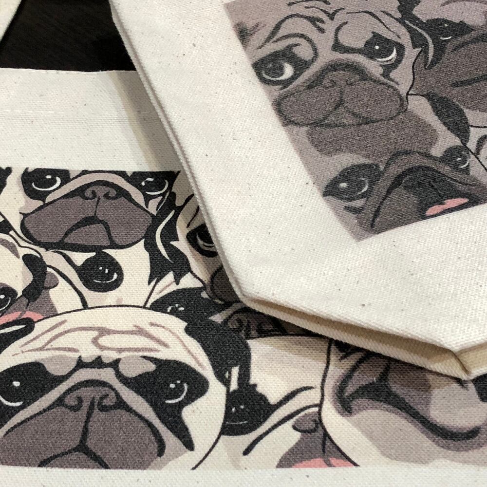 可愛いパグのお顔ををギュウギュウに詰め込んだお散歩バッグです、このバッグにお散歩道具を入れて愛犬のお散歩にGO!です。