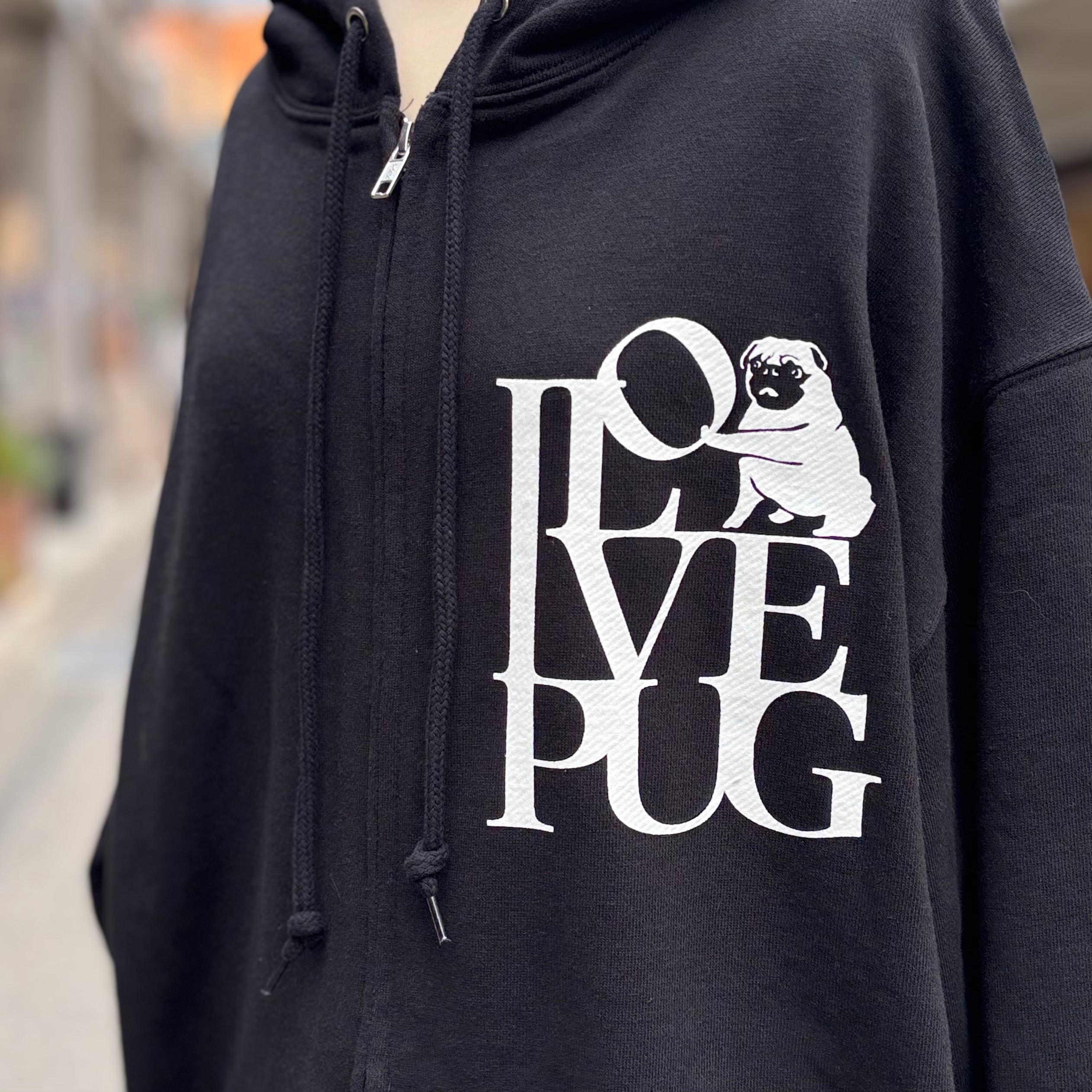 2025新デザイン I LOVE PUGのジップアップ(前開きファスナー)パーカーです!フロントとバック両面にプリントが入ります