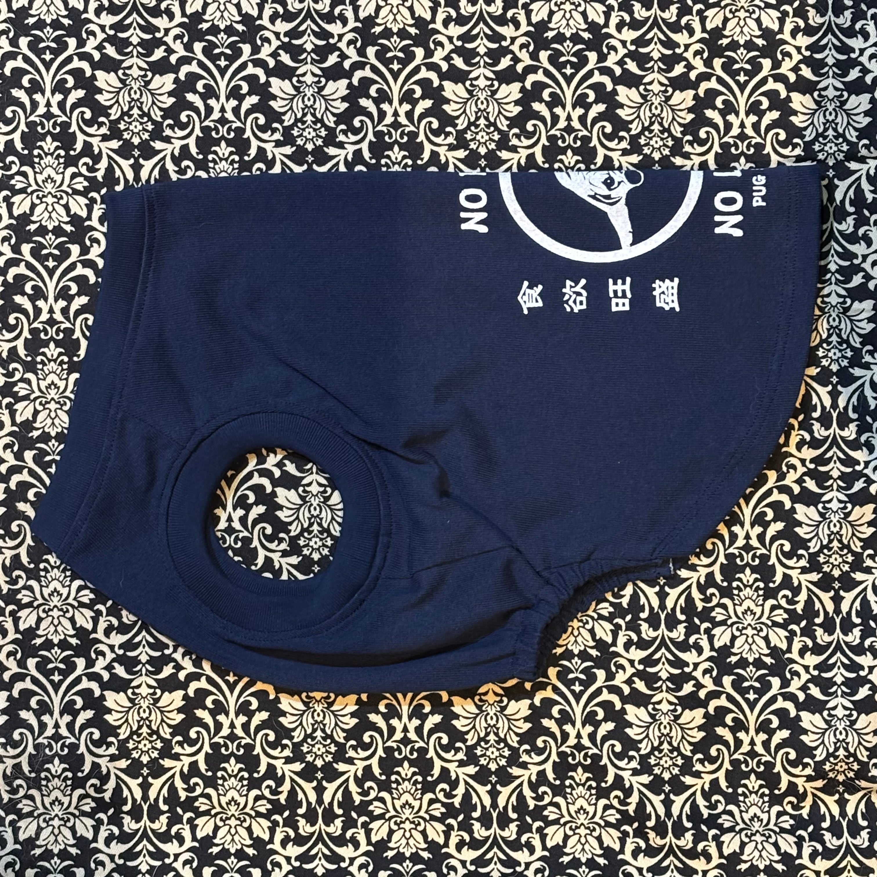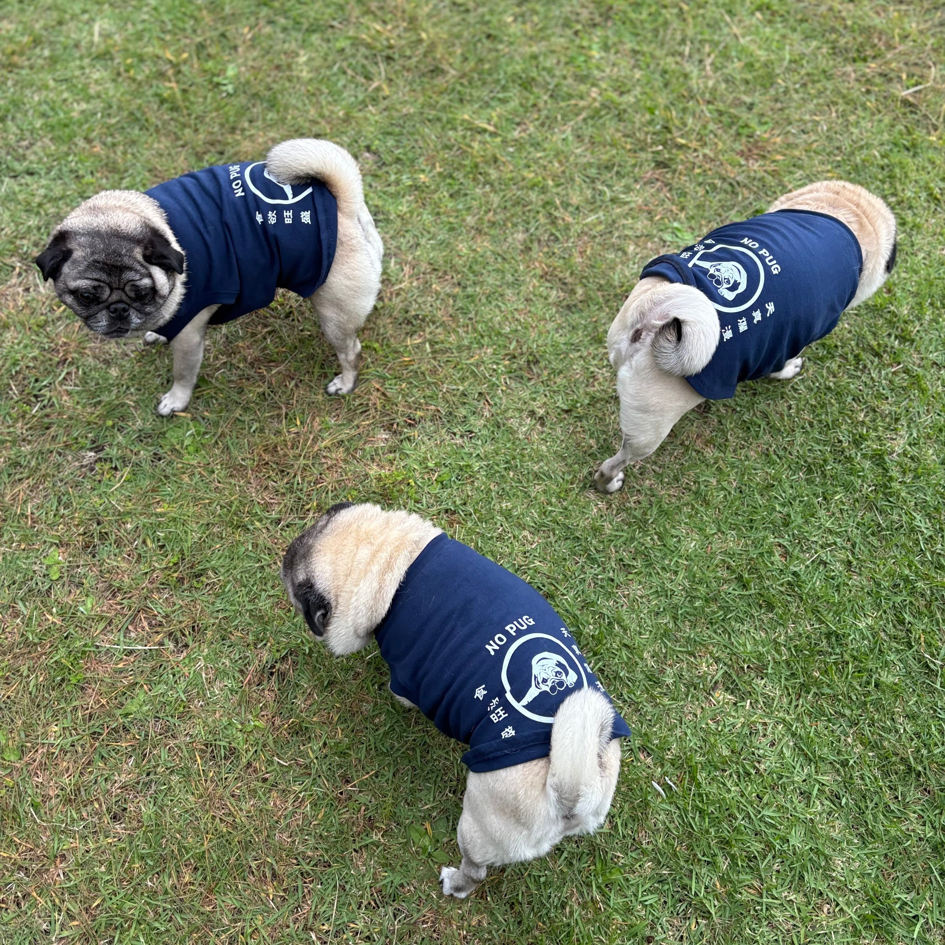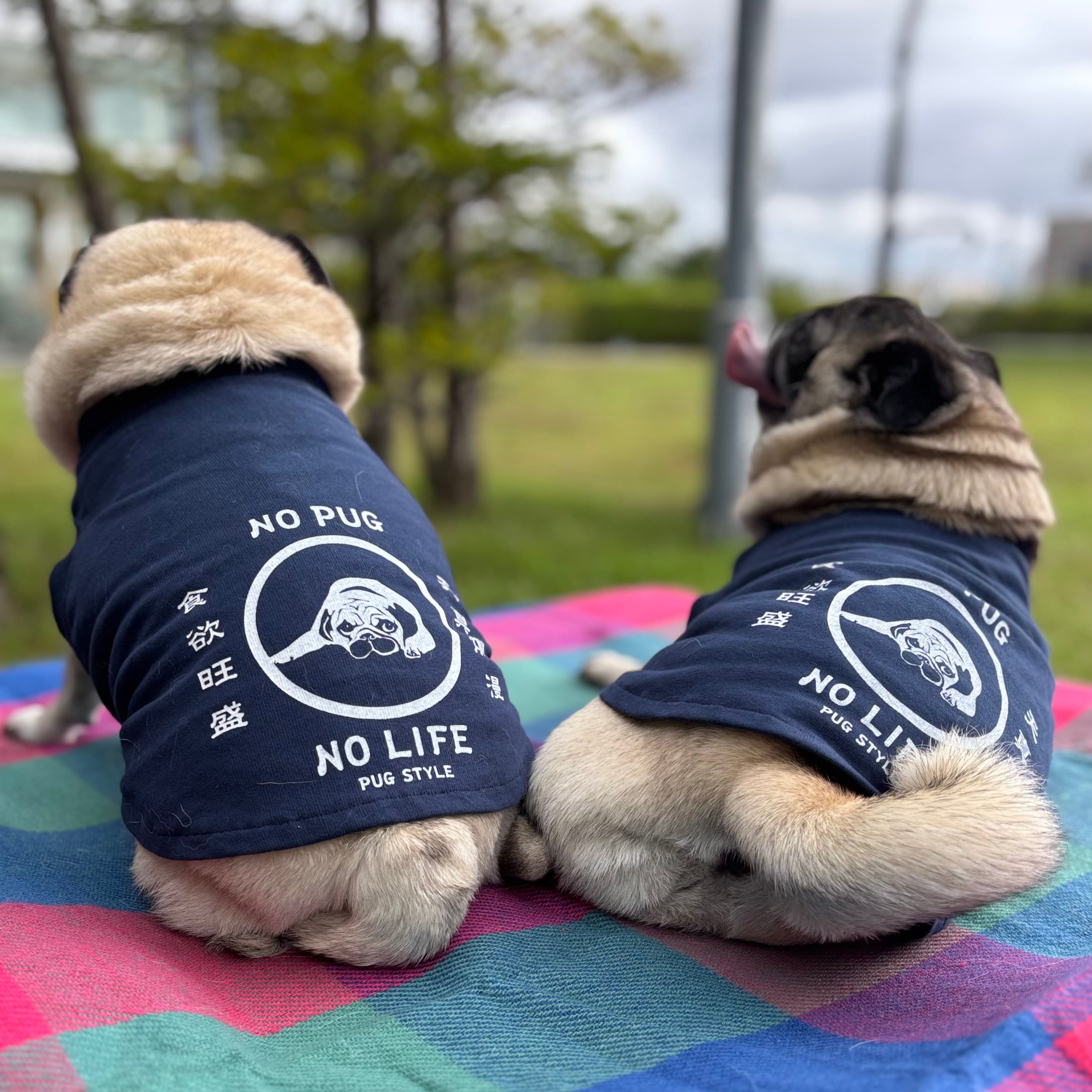 構想5年以上、やっとできました!!パグに合わせた形で3サイズ、プリント位置も太めなハーネスをつけても隠れないように腰部分に配置しました