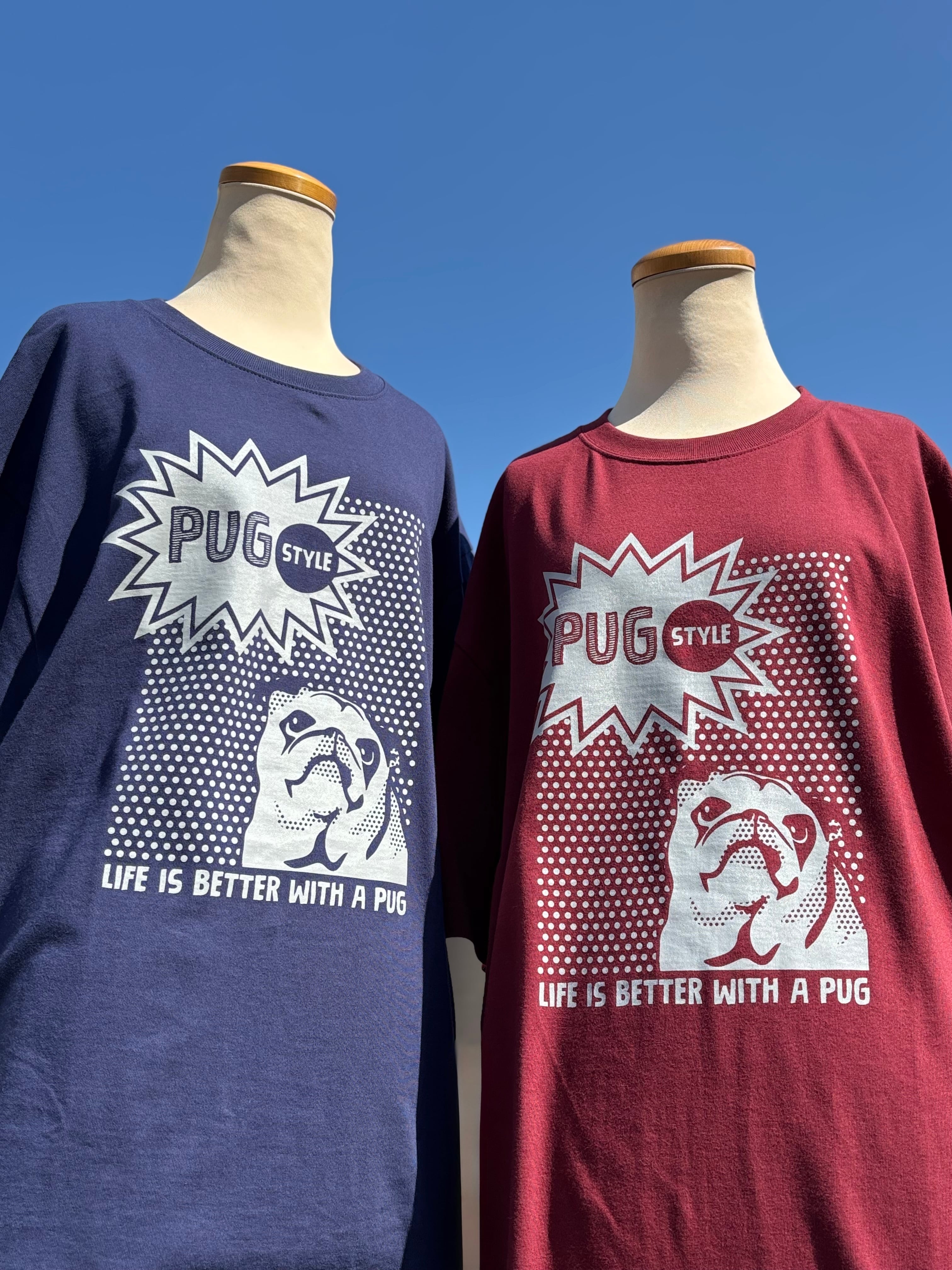 アメコミっぽく大きめなパグの顔を入れました、インパクトあるデザインですが色目を抑えましたので普段にも使いやすいと思います